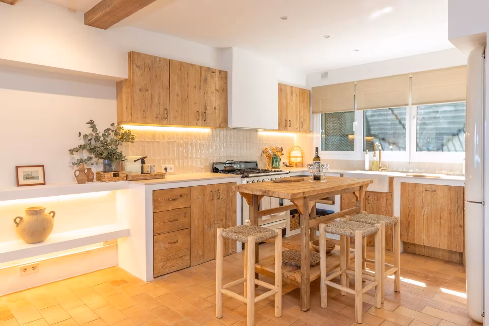 The modern kitchen is designed for both convenience and style, featuring premium SMEG appliances, including: